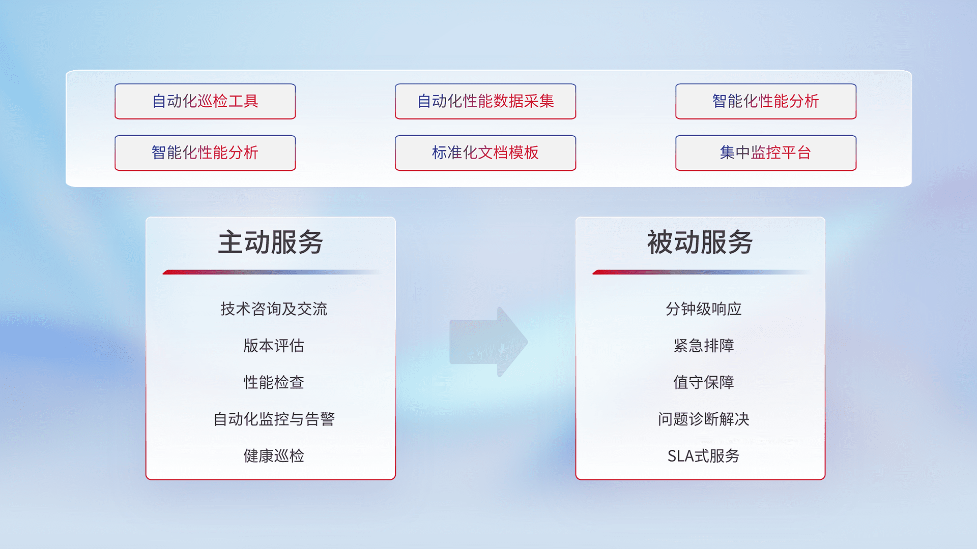 智能化工具和标准化文档,,,保障服务质量,,提供主动服务(包含技术咨询、、版本评估、、、、性能检查、、、、自动化监控与告警、、健康巡检)和被动服务包含(分钟级响应、、、紧急排障、、、值守保障、、问题诊断解决、、、SLA服务)。。。